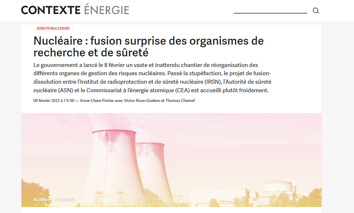 Toujours en ce début février 2023, la rubrique « énergie » de Contexte a publié un article d’Anne-Claire Poirier sur le chantier de fusion des organes de gestion des risques nucléaires dans le parc français. Poirier tweete l’article en reprenant les informations principales, ce qui fait aussitôt réagir Tristan Kamin sur une mention de Tchernobyl, sur un ton agressif : « Hein ? Mais ? HEIN ? L’écosystème actuel date de 2006 (Tchernobyl+ 20 ans) et il n’est pas question de revenir au système pré-Tchernobyl. Là tout de suite je m’inquiète moins de la fusion ASN/IRSN que de la fusion Contexte/Reporterre ! » Il parle ensuite de « sottises » et fait la leçon à la journaliste : « Votre thread fait comme si la loi TSN n’existait pas alors qu’elle est purement et simplement la base de toute l’organisation actuelle et future de la sûreté nucléaire qui est l’objet de votre article » Avant d’avouer, quelques minutes plus tard, qu’il n’a en fait pas lu l’article lorsqu’elle le lui fait remarquer – puis, deux semaines plus tard, qu’il n’avait aucune idée des conséquences de la fusion des organes de gestion des risques, pourtant critiquée par les syndicats et nombre d’experts.