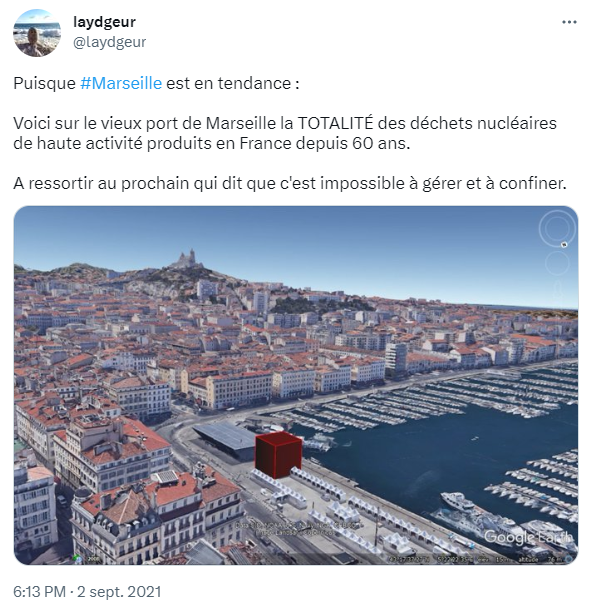 Par exemple lorsqu’un autre compte pro-nucléaire influent, Laydgeur, tweetait un montage destiné à montrer que « la totalité des déchets nucléaires de haute activité produits par la France depuis 60 ans » pourraient tenir dans le Vieux-Port de Marseille (montage qu’il poste à répétition depuis 2019). « J’avais répondu que ça n’avait aucun sens parce que ce n’est pas une question de volume, et j’avais reçu beaucoup de réponses de pro-nucléaire », se souvient Victor Roux-Goeken. Il s’était alors contenté de rappeler que l’étendue de la zone d’implantation du projet de stockage profond Cigeo représentait 29 km², « soit un huitième de la surface de Marseille ».