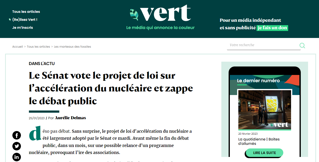 Auprès d’ASI, Loup Espargilière déplore qu’à travers ce refus de débattre, c’est la question du débat démocratique qui se pose : « La relance du nucléaire est un choix important, qui engage la France sur plusieurs générations, dit-il. C’est donc très important qu’on ait un débat politique et médiatique dessus : quel avenir énergétique, pour quels besoins, voulons-nous en tant que société ? » Mais ce débat est pour l’instant impossible, ajoute-t-il, puisque « le simple fait de dire qu’il faudrait débattre du nucléaire et de l’avenir énergétique de la France énerve beaucoup de gens ». Il cite l’exemple récent d’un article de Vert qui regrettait l’absence de débat au Sénat sur l’accélération du nucléaire : « Je ne m’attendais pas à recevoir autant de commentaires, se souvient Loup Espargilière. C’était du genre : «ce n’est pas votre avis, c’est la science qui compte, pas les citoyens.» Le débat sur l’accélération du nucléaire est compliqué, mais aucun débat ne devrait être trop compliqué pour la démocratie. Interdire par principe le débat sur un sujet, c’est sidérant. » Jean-Christophe Féraud abonde : « Remettre en cause ce qui leur paraît être le momentum du nucléaire, ça les rend dingues. »